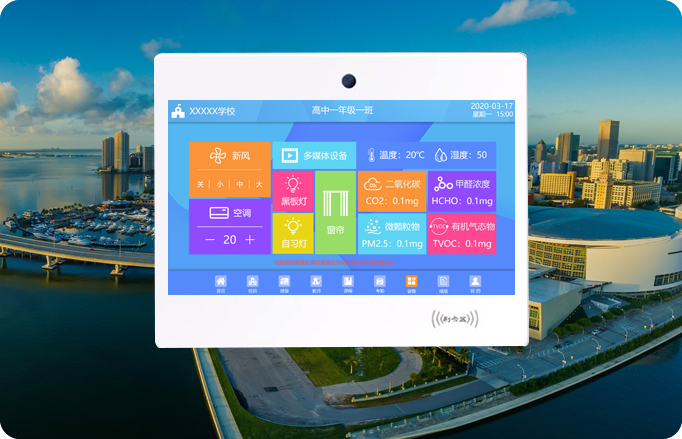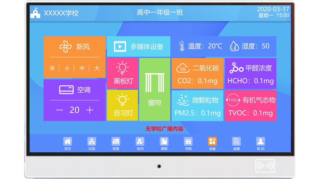 以及二氧化碳、甲醛濃度等教室設(shè)備環(huán)境進(jìn)行一鍵控制,上課、自習(xí)、午休等多種場景模式,