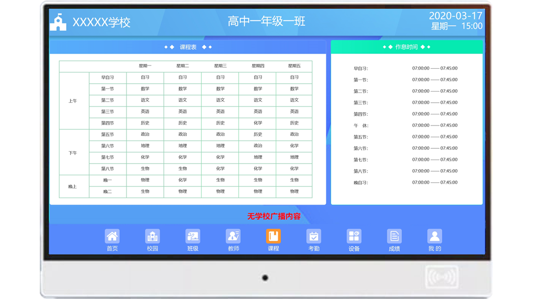 對所在班級的課程安排以及學(xué)校的作息時間的展示,讓師生合理安排時間,增強(qiáng)時間觀念。