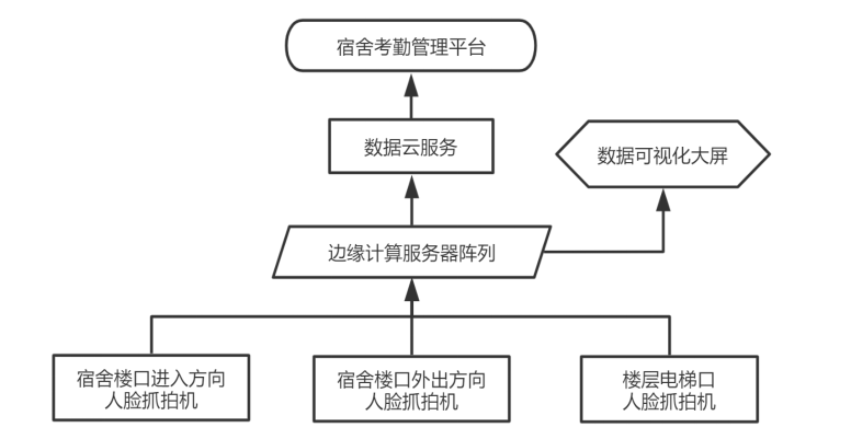 基于本校宿舍基本情況,結(jié)合學(xué)校運營管理模式,將宿舍考勤系統(tǒng)軟硬件模塊按照如下架構(gòu)圖部署。綜合樓大門處出入兩方向根據(jù)樓道寬度分別安裝2-4個人臉識別抓拍機,6-11樓層電梯口各安裝2-3個人臉識別抓拍機,抓拍機視頻圖像數(shù)據(jù)通過網(wǎng)絡(luò)路由設(shè)備實時匯總*宿管邊緣計算服務(wù)器陣列,服務(wù)器將視頻流信息中解析出的人臉數(shù)據(jù)與校方學(xué)生人臉庫信息進(jìn)行實時N比N快速驗證,獲得學(xué)生身份信息,將對比結(jié)果實時顯示在數(shù)據(jù)可視化大屏上。結(jié)合學(xué)校考勤及宿舍管理邏輯,將各維度報表分析推送*云服務(wù)器,校方管理人員可通過宿舍考勤管理平臺獲取數(shù)據(jù)分析結(jié)果。
